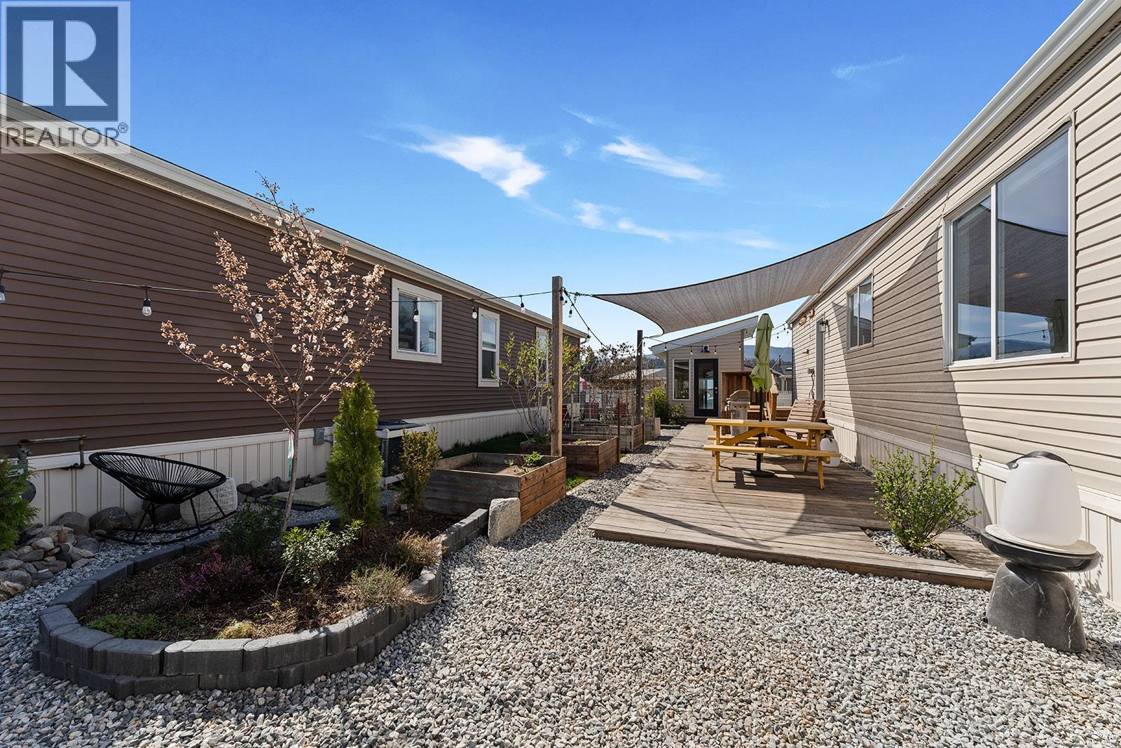 Beautiful like new 3 bedroom, 2 bathroom 2017 built home in a well managed and secure park with a 99 year lease, welcome to ""Belaire Estates"". This original owner 1,088 sq.ft. manufactured home is conveniently located near the front of the park for quick access and amongst the newer built homes of the park. This home features a bright open-concept layout with numerous upgrades throughout. The spacious kitchen offers ample cabinetry and prep space, flowing seamlessly into the inviting living and dining areas, Step outside to a private, beautifully landscaped yard with exceptional patio areas, ideal for relaxing or hosting guests. A standout feature is the detached 11’ x 8’ studio with vaulted ceilings, a good space for a home office, gym, or creative retreat. Pride of ownership is evident throughout this move-in ready home. Just 15 minutes to Kelowna. 1 pet under 30 lbs allowed, 650 min credit score required. Book your showing today! (id:4069)